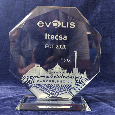 Reconocimientos elaborados en cristal jade con logo, nombres y texto grabados.